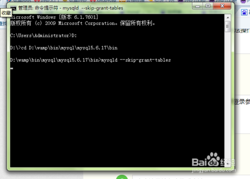 3.输入命令 mysqld --skip-grant-tables 回车,此时就跳过了mysql的用户验证。注意输入此命令之后命令行就无法操作了,此时可以再打开一个新的命令行。注意:在输入此命令之前先在任务管理器中结束mysqld.exe进程,确保mysql服务器端已结束运行。