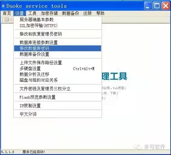 点击多可服务器管理工具菜单栏“设置”>“修改数据库密码”,就可以进入修改数据库密码界面。
