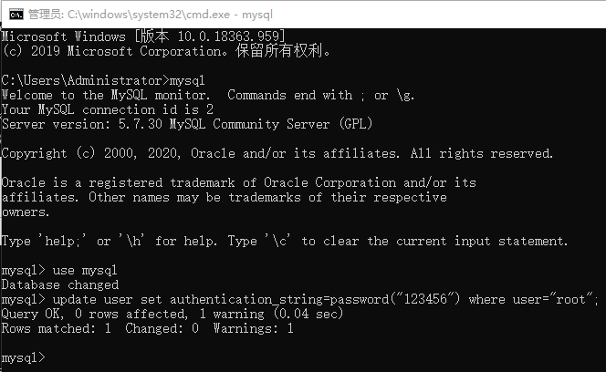 6.输入命令,修改密码:update user set password=password("123456") where user="root";