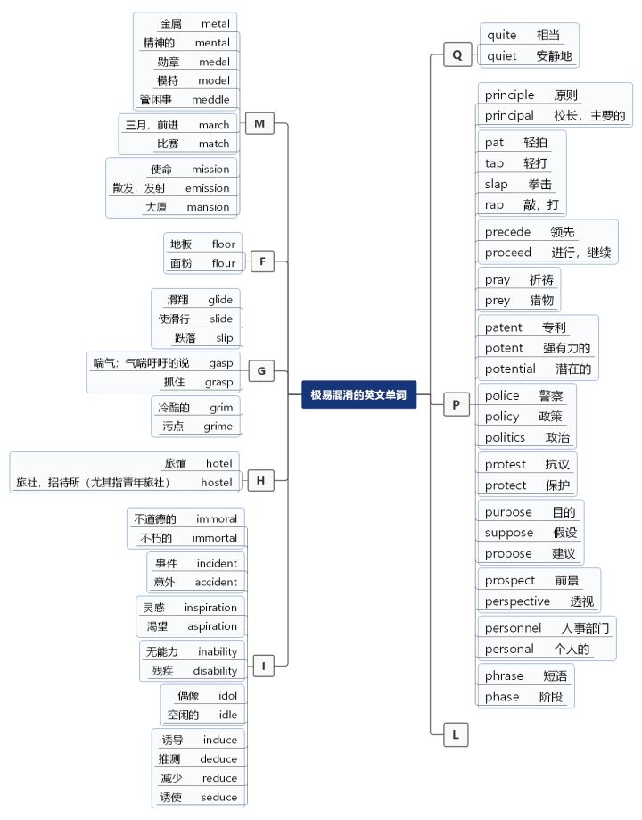 知识归纳型思维导图通常是小知识点、易弄混知识点的合集归纳。某一门课,总有些小知识点游离在记忆边缘或因为很相近容易弄混,比如某些拼写非常相似的英文单词、针对某个理论有多个人发表过观点。