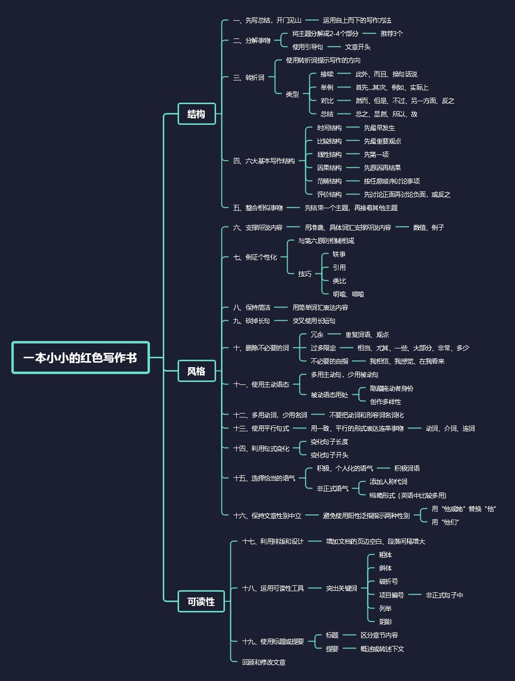 上面这一小段话源自《一本小小的红色写作书》的前言,所以显而易见这是一本讲述写作方法的书籍,书中从【结构-风格-可读性】三个层次给出相应的通用性写作原则,不管是写作新手还是暂遇瓶颈的老将都适用,所以小M在此推荐这本书(简短、易读、实用),并简单讲讲书中内容。 先用思维导图看看本书的重点内容▼▼▼