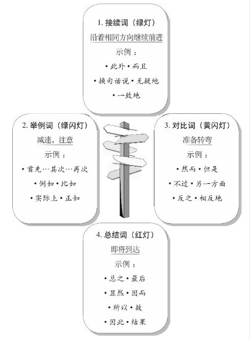 “但是、然而之类的'转折'词被称作语言的交通灯,它们有四大作用:对比、举例、接续和总结”,这个原则与我们常说的欲扬先抑、欲抑先扬异曲同工。“小王,最近表现不错,但是(但是后面才是重点)”。以下为四类常用转折词,包括连接词、举例词、对比词、总结词。