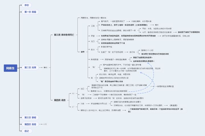 该导图的作者从情节的维度进行了梳理,以时空为线索整理为情节类提纲。需要针对情节线索列提纲的创作者参考一下吧,当然不是参考内容啦。