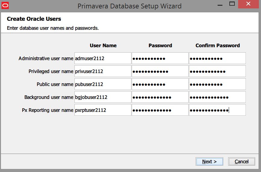 P6数据库有5个帐号,每个帐号都各有其用途,除了pubuser 作为公共帐号用作professional连接考虑好记即可,其他几个建议使用符合企业安全策略要求的格式