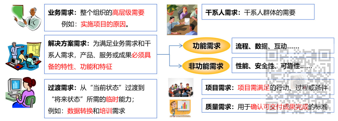 1、需求包括业务需求、干系人需求、解决方案需求、过渡需求、项目需求和质量需求。