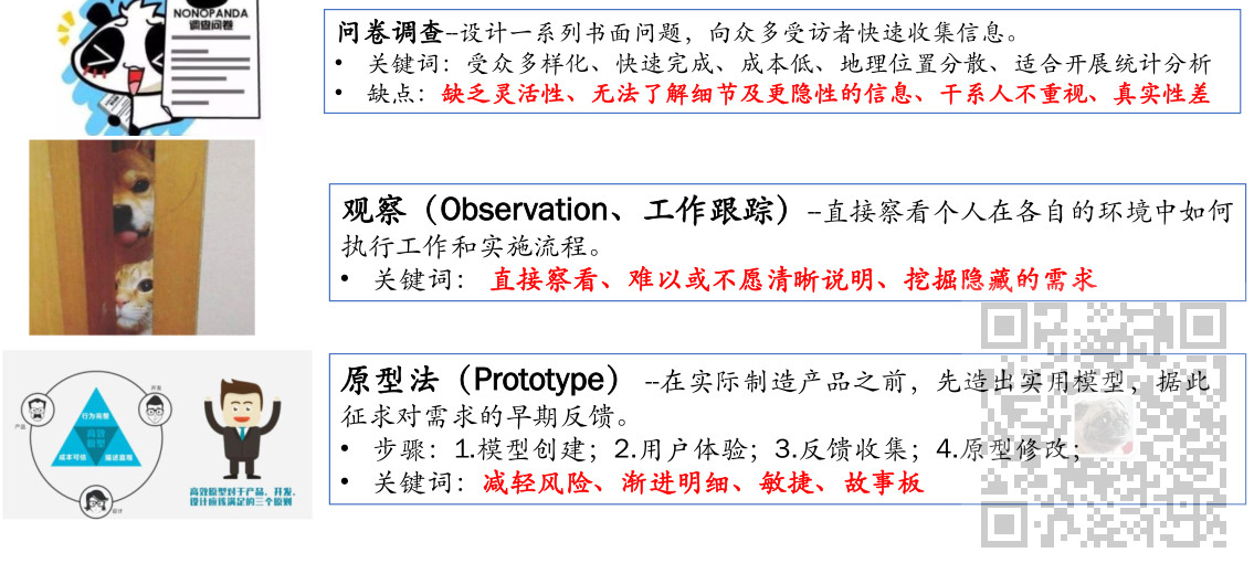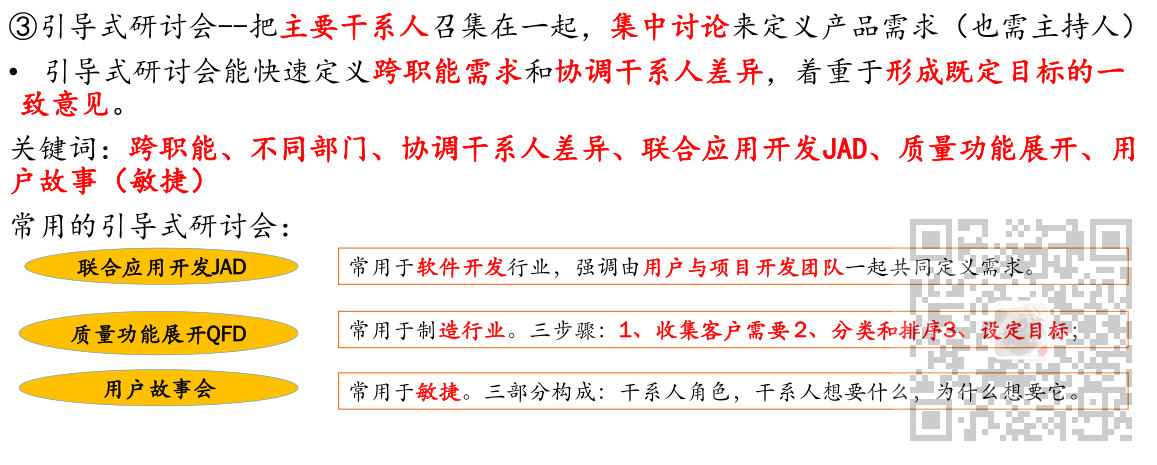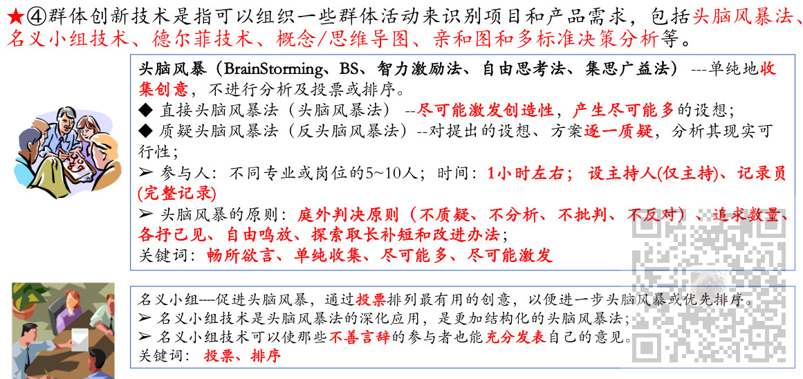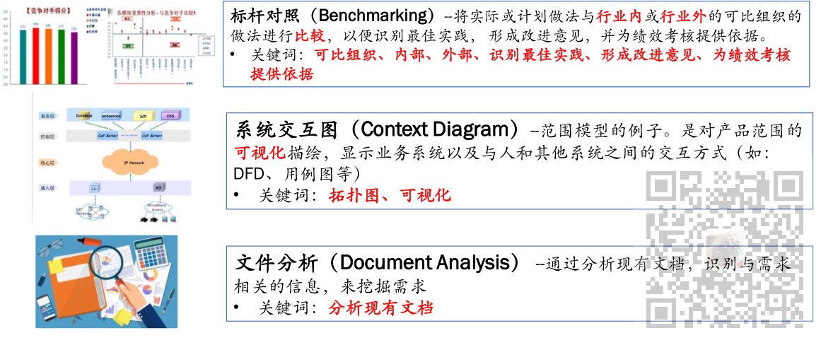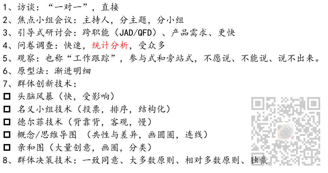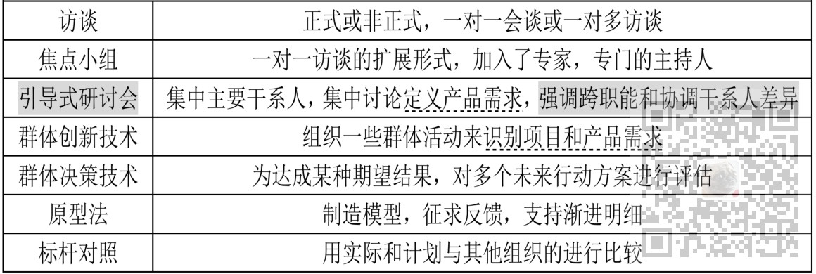 2、收集需求的工具与技术有访谈、焦点小组、引导式研讨会、群体创新技术、群体决策技术、问卷调查、观察、原型法、标杆对照、系统交互图、文件分析等。