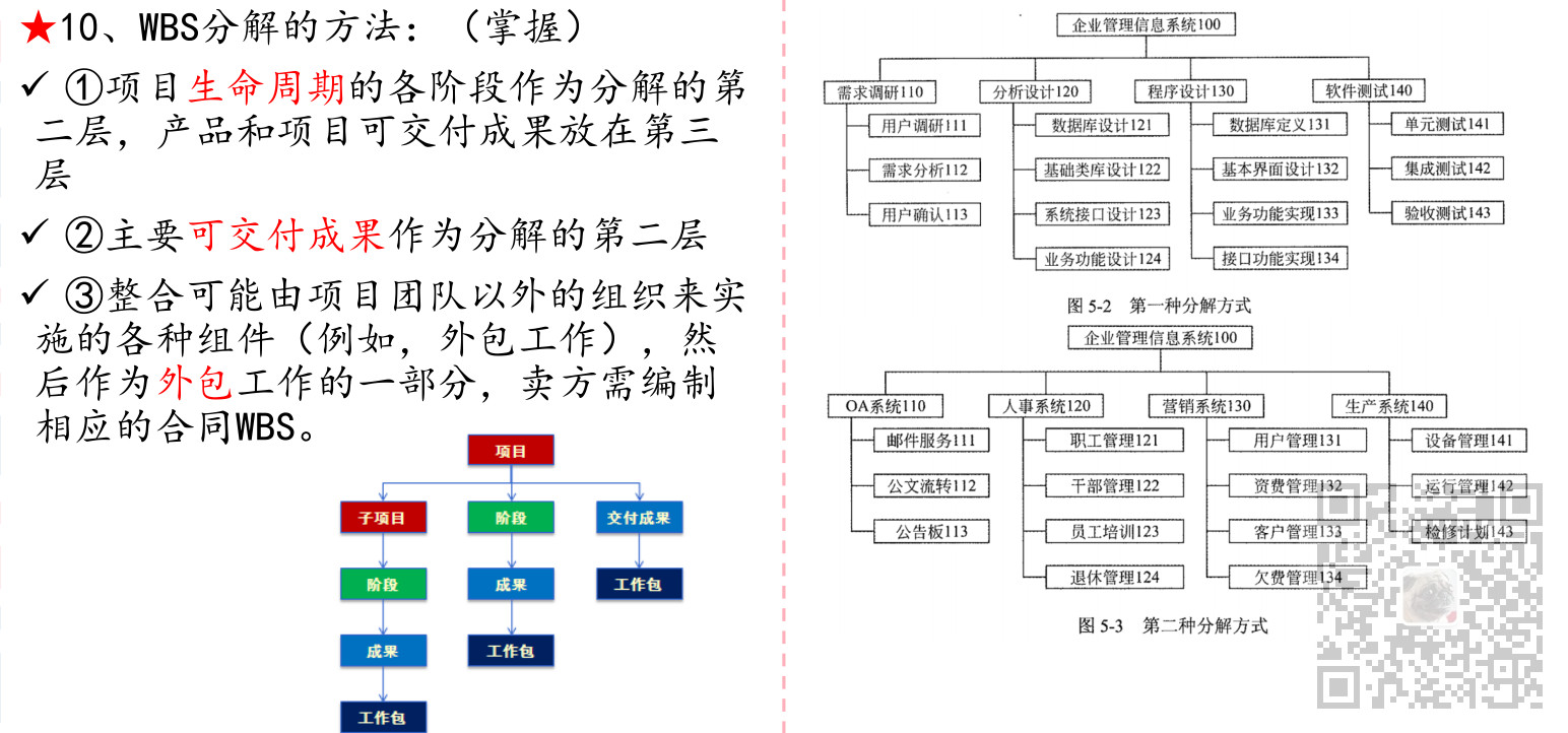 ⑥WBS应包括项目管理工作(因为管理是项目具体工作的一部分),也要包括分包出去的工作。