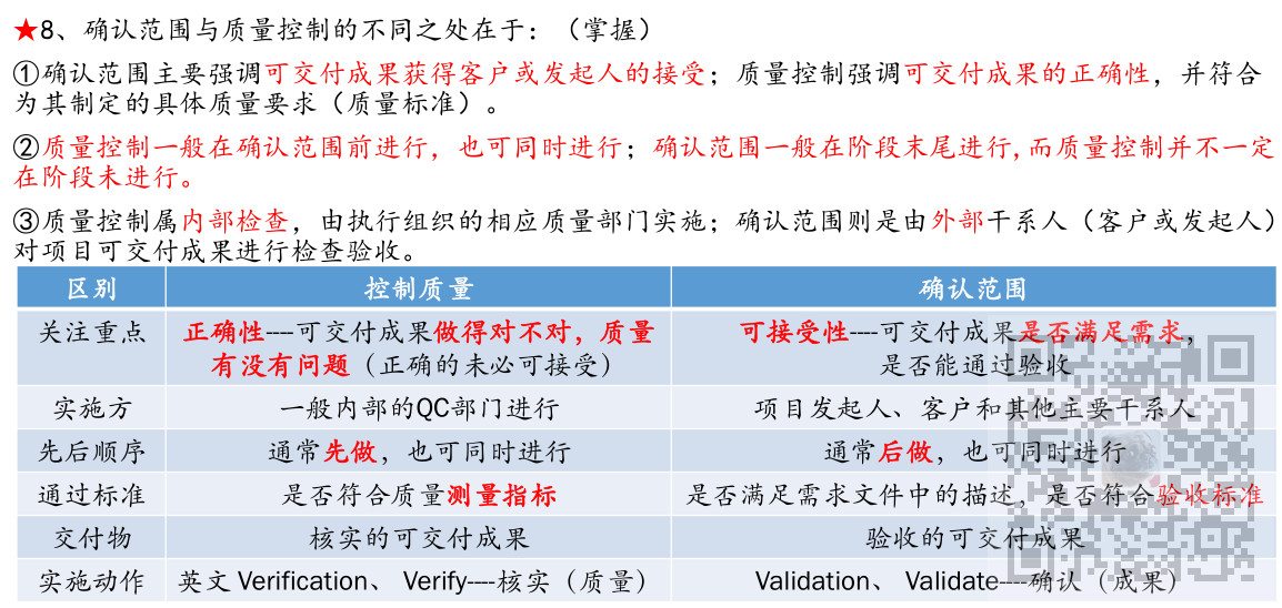 ②确认范围与项目收尾都有验收工作,确认范围强调验收项目可交付成果,项目收尾强