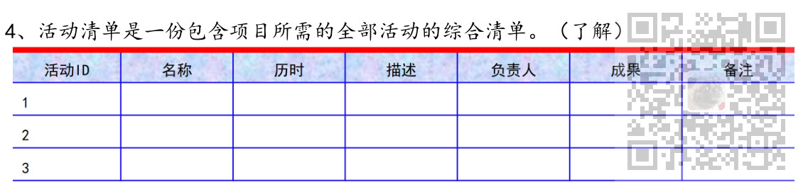 包分解为活动,作为对项目工作进行估算、进度规划、执行、监督和控制的基础。(掌握)