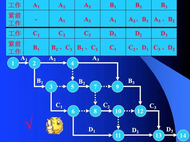 (1)关键线路的判定方法:从起点节点到终点节点为止,持续时间最长的线路。工期是完成一项任务所需要的时间。计算工期 Tc;要求工期 Tr;计划工期 Tp。