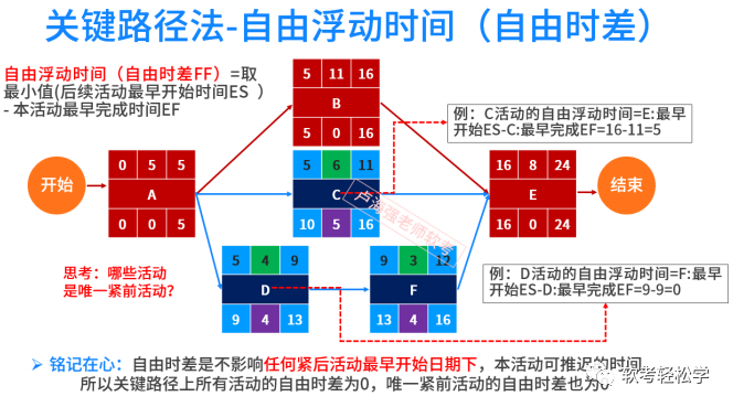 ①自由时差的概念:某工作在不影响其紧后工作最早开始的前提下所具有的机动时间。