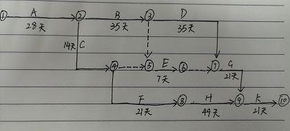 3、若项目组将B和H均压缩至30天,可以满足。(1分)压缩后项目的关键路径有3条,两条关键路径. 上的活动分别是BGI与ADH、ADI (1分)