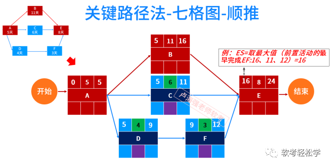 比如B活动的,最早开始时间是第5天(实际是第6天(5+1)。为了推送方便填5),最早完成时间第16天。从左往右边推算。比如从A开始算起,再B、E