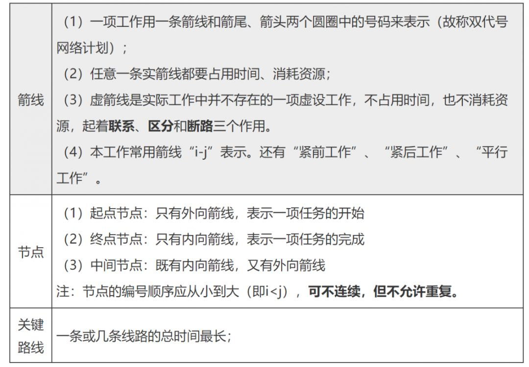 (3)网络图的基本绘制要求:①只有一个起点及终点;②箭线从小节点编号指向大编号;③不允许有循环回路。