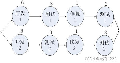 某项目进入详细详细设计阶段后,项目经理为后续活动定义了如图所示的网络计划图,图中的“△”标志代表开发过程的一个里程碑,此处需进行阶段评审,模块1和模块2都需要通过评审后才能开始修复。