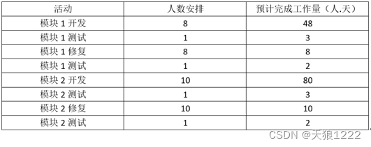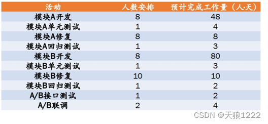 项目经理对网络图中的各活动进行了成本估算,估计每人每天耗费的成本为1000元,安排了各活动的人员数量并统计了模块1、模块2的开发和测试活动的工作量(如表2所示),其中阶段评审活动不计入项目组的时间和人力成本预算,如表2所示。