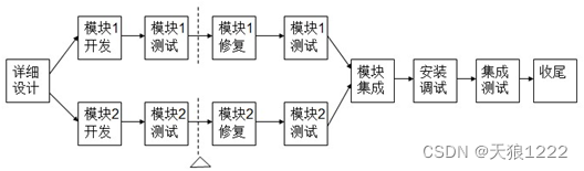 详细设计完成后,项目组用了11天才进入阶段评审。在阶段评审中发现:模块1开发已完成,测试尚未开始;模块2的开发和测试均已完成,修复工作尚未开始,模块2的实际工作量比计划多用了3人•天。