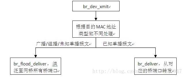 其中指定了网桥这种网络设备的发送方法为函数br_dev_xmit,即比如应用程序使用send函数族系统调用从网桥发送报文时,将最终调用br_dev_xmit函数,其处理逻辑依然遵循网桥原理或者说就是二层交换原理,已知单播报文即按MAC地址转发,广播/组播/未知单播报文洪泛到所有桥端口,处理流程如下: