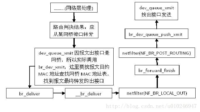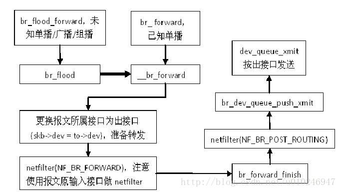转发最终均调用dev_queue_xmit,这和所有的报文发送的道理是一样的,需要注意的是转发接口的更换和网桥转发的两次netfilter,如下图: