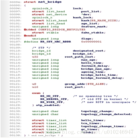 创建网桥后,需要再加入接口,网桥的每一个接口在linux内核中以net_bridge_port结构体描述,在内核中称为桥端口,如下: