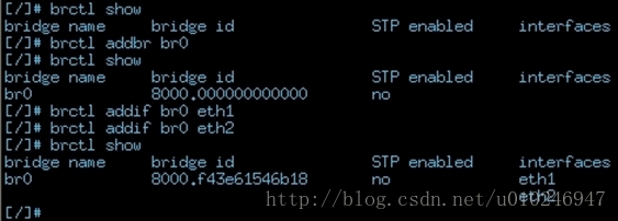 初始情况下,没有网桥,由命令“brctl addbr br0”创建一个网桥br0,然后可以观察到创建了网桥br0,此时它底下还没有接口,然后由命令“brctl addif br0 XXX”在网桥br0下加入接口eth1、eth2,然后可以观察到网桥br0底下有这两个接口;同时网桥br0的MAC地址表还加入了两个静态的MAC地址,分别是接口eth1和eth2的MAC地址,这时如果从eth1接口进入属于网桥br0的报文,并且该报文的目的MAC地址与eth2接口的MAC地址相同,那么报文将被从eth2接口转发出去,并且会记录该报文的源MAC地址和进入接口eth1的对应关系作为网桥br0的一个动态MAC地址条目。