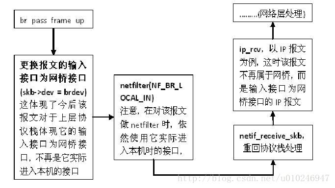 切记这里的传入本机,并不一定是要传入本机传输层,而仅仅是意味着该报文的目的MAC地址是该网桥下某桥端口对应接口的MAC地址,即报文穿过网桥继续走本机协议栈进行进一步处理,如下图: