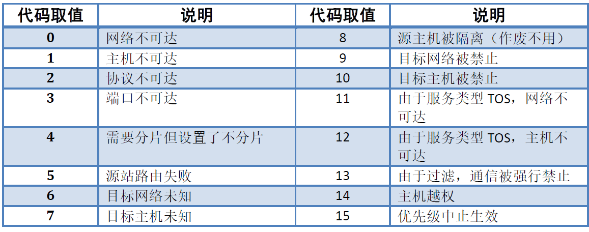 第二个字节是代码(Code)字段,它进一步描述了产生这种类型ICMP 报文的具体原因。因为每种类型的报文都可能有多个,比如目的不可达报文,产生这种原因可能有主机不可达、协议不可达、端口不可达等多个原因。