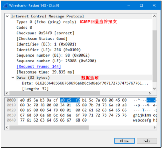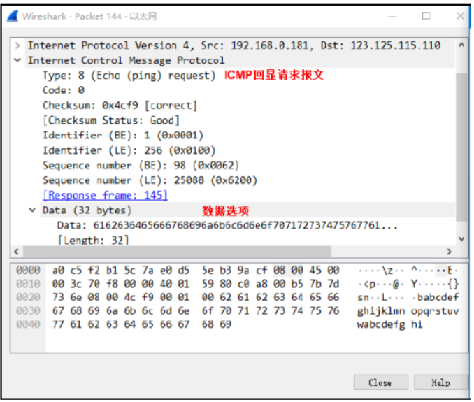 ICMP 报文首部剩下的4 字节内容分为了两个字段,标识符用于标识在同一台主机上同时运行了多个ping 程序,ping 程序也可以识别出返回的信息。序列号从0 开始,每发送一次新的回显请求就进行加 1。 ping 程序打印出返回的每个分组的序列号,允许我们查看是否有分组丢失、失序或重复。数据选项区域表示回显请求报文中可包含的数据,其长度是可选的,发送方选择合适的长度并且填充该段数据,在接收方,它会根据这个会回显请求返回一个回显应答报文,回显应答报文中的数据选项区域是与回显请求报文的数据选项区域完全一致。