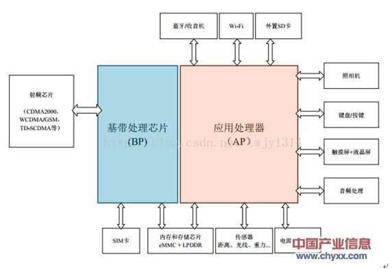 移动芯片是移动智能终端的关键器件。移动芯片包含了应用处理器、基带芯片、射频芯片、电源管理芯片和存储芯片。其中最重要的芯片是基带芯片(BP)和应用处理器(AP),二者结合在一起成为移动智能终端的CPU。中国产业信息网(http://www.chyxx.com)