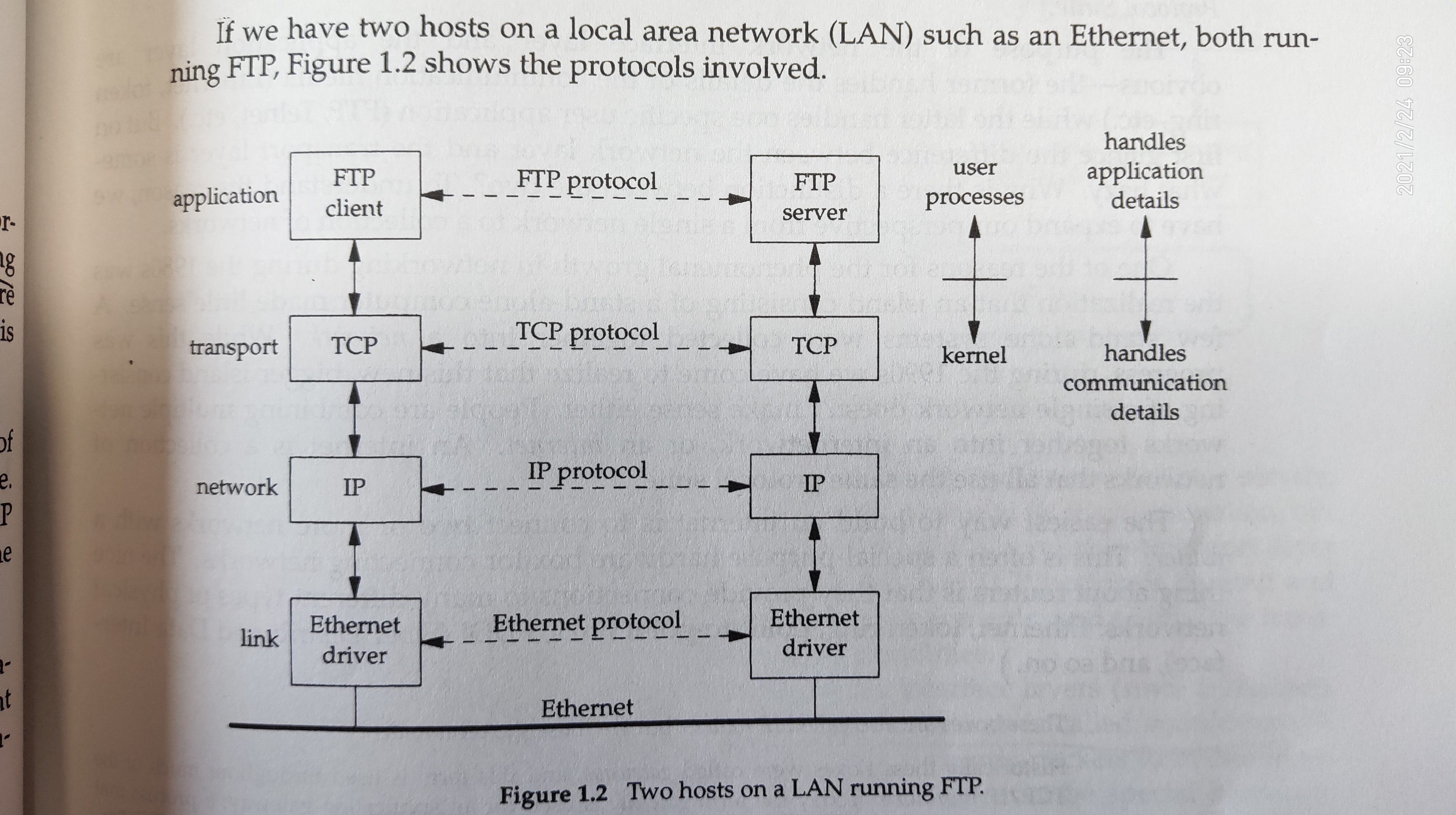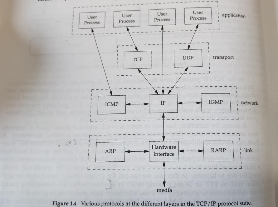 | Llink 链路层 | 包括设备驱动及对应的网卡,它们一起处理通信介质细节(together they handle all the hardware details of physically interfaceing with the cable),比如 Ethernet, token ring 等