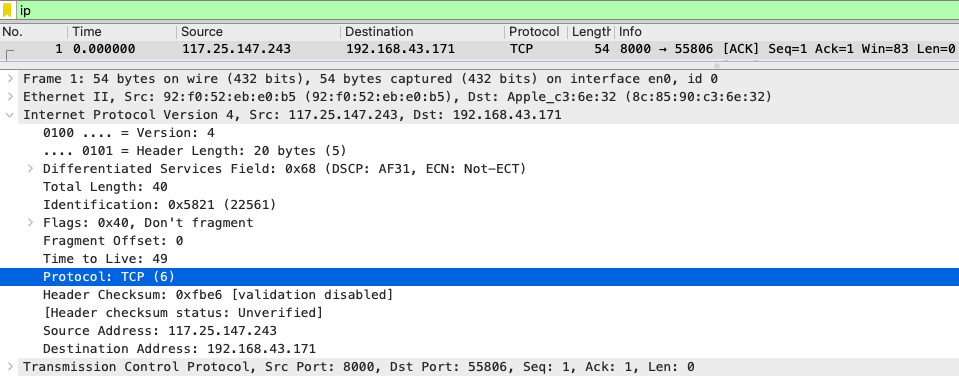 - IP datagram:数据经过IP层添加头部发送给网络接口(network interface)后,称为 IP报文