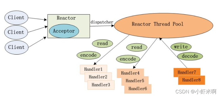 当一个新的连接连接到server端的时候,首先是acceptor接受到这个请求,然后将该请求派发给后面的线程池,然后线程池选择一个线程对数据进行一个解码,计算等处理.acceptor仅仅需要一个线程即可处理客户端的很多连接