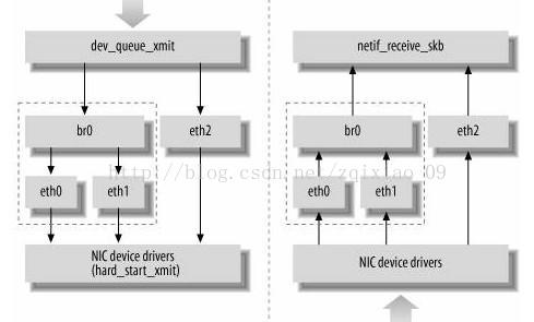 网桥设备br0绑定了eth0和eth1。对于网络协议栈的上层来说,只看得到br0,因为桥接是在数据链路层实现的,上层不需要关心桥接的细节。于是协议栈上层需要发送的报文被送到br0,网桥设备的处理代码再来判断报文该被转发到eth0或是eth1,或者两者皆是;反过来,从eth0或从eth1接收到的报文被提交给网桥的处理代码,在这里会判断报文该转发、丢弃、或提交到协议栈上层。