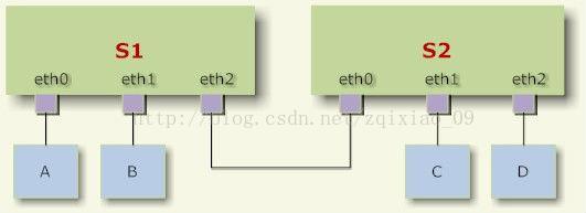 如下图:主机A发送的报文被送到交换机S1的eth0口,由于eth0与eth1、eth2桥接在一起,故而报文被复制到eth1和eth2,并且发送出 去,然后被主机B和交换机S2接收到。而S2又会将报文转发给主机C、D。