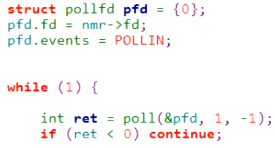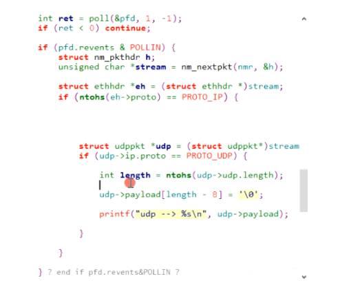 现在我们调用的是一个poll,他通知到我们应用程序,现在这里已经有包了,我们现在再来取,再来把那个nm_nextpkt包取出来,请注意它是取,但是我们没有做copy。