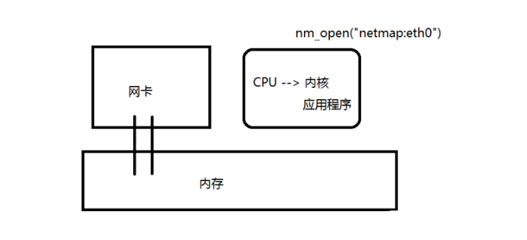 第一个这里画三个东西,第一个这里是一个网卡,这里是个CPU,CPU上面在这里有一个不等同的概念,就是可以在这里理解为那个内核 被理解为我们所有在CPU上面执行的东西需要通过CPU,这里面,包括内部包括我们的应用程序,包括我们自己写的代码应用程序就在CPU上执行的。 好还有一个板块就是内存将网卡映射到内存中间,内存将网卡映射到内存中间, 现在我们的应用程序是直接在网卡里面取数据的,直接在网卡里面取数据,所以在这里面我们写的第一个, 首先第一个先让neymap先工作起来,那就是直接发出去没错,直接接收数据和发送数据, 有的网卡安装出来之后叫eth0也有的叫ens33,