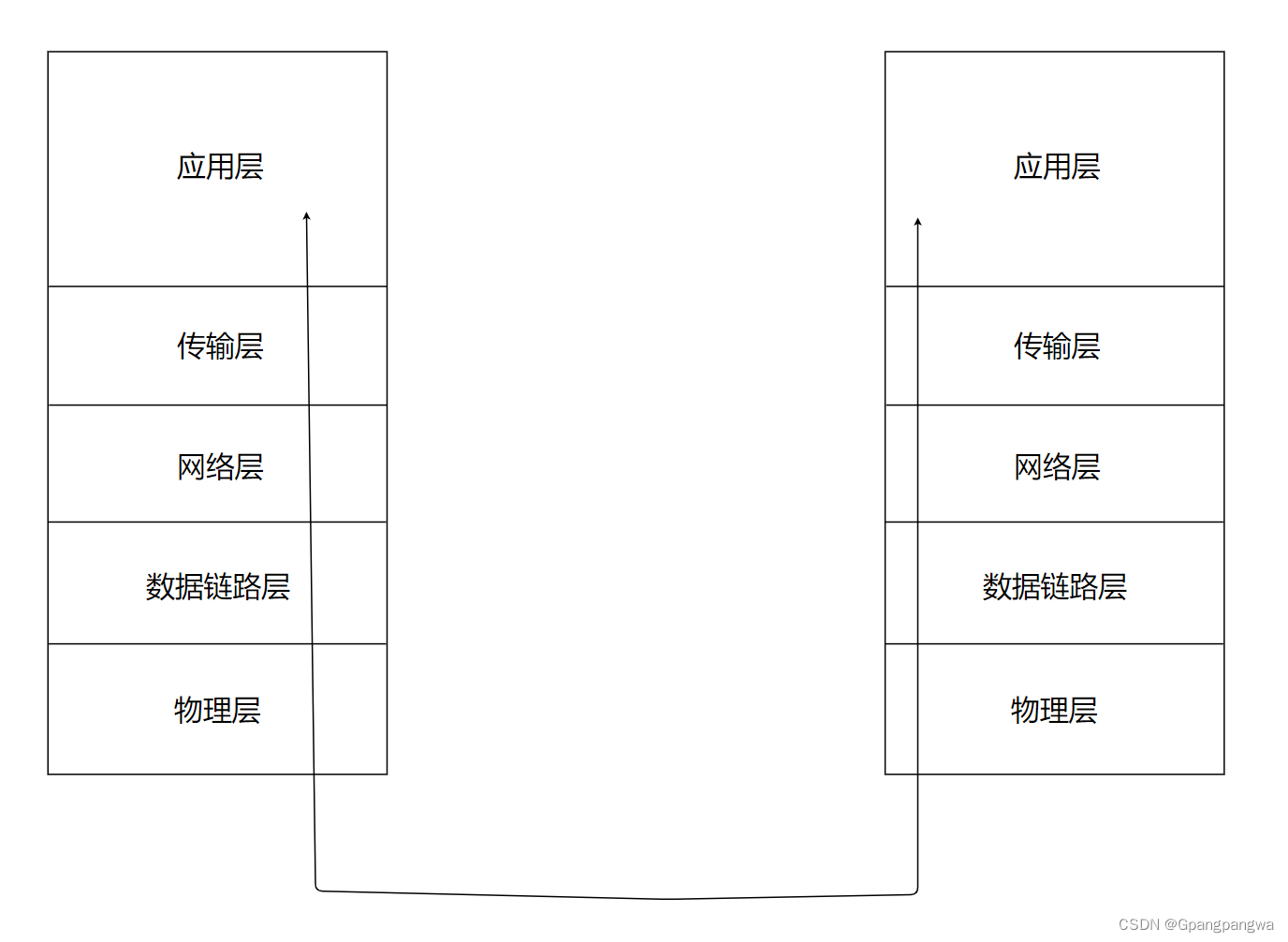 对于两台建立通讯的主机,数据传输都是从本地主机的应用层的协议出发,经过从上至下的协议处理发送给另一台主机;另一台主机物理层接收到数据后,从下至上层层通过协议处理上传至应用层。