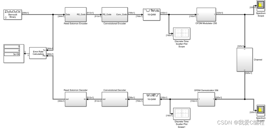 以上就是难过魔镜最近收集整理的关于基于simulink的WiMax通信系统仿真,包括RS编译码,卷积编译码,OFDM,输出星座图和频谱图1.算法仿真效果2.MATLAB/simulink核心程序3.算法涉及理论知识概要4.完整MATLAB的全部内容,更多相关基于simulink内容请搜索靠谱客的其他文章。