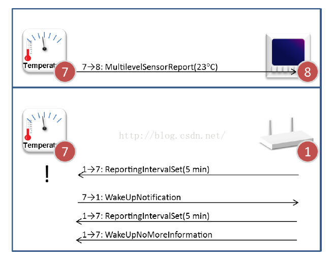 下面的例子Wakeup node实现一个温度计传感器。这个节点周期性的醒来,然后测量一次温度,然后上报度数给一个显示设备。它可能会隔很长一段时间(例如每70分钟)发送一个WakeUp Notification给网关,通知网关它醒了,有什么事情需要它做的没有?