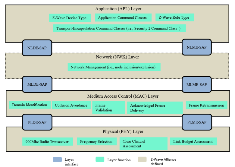 在这两个较低的层的基础上,Z-Wave联盟定义了网络层(NWK)和应用层。