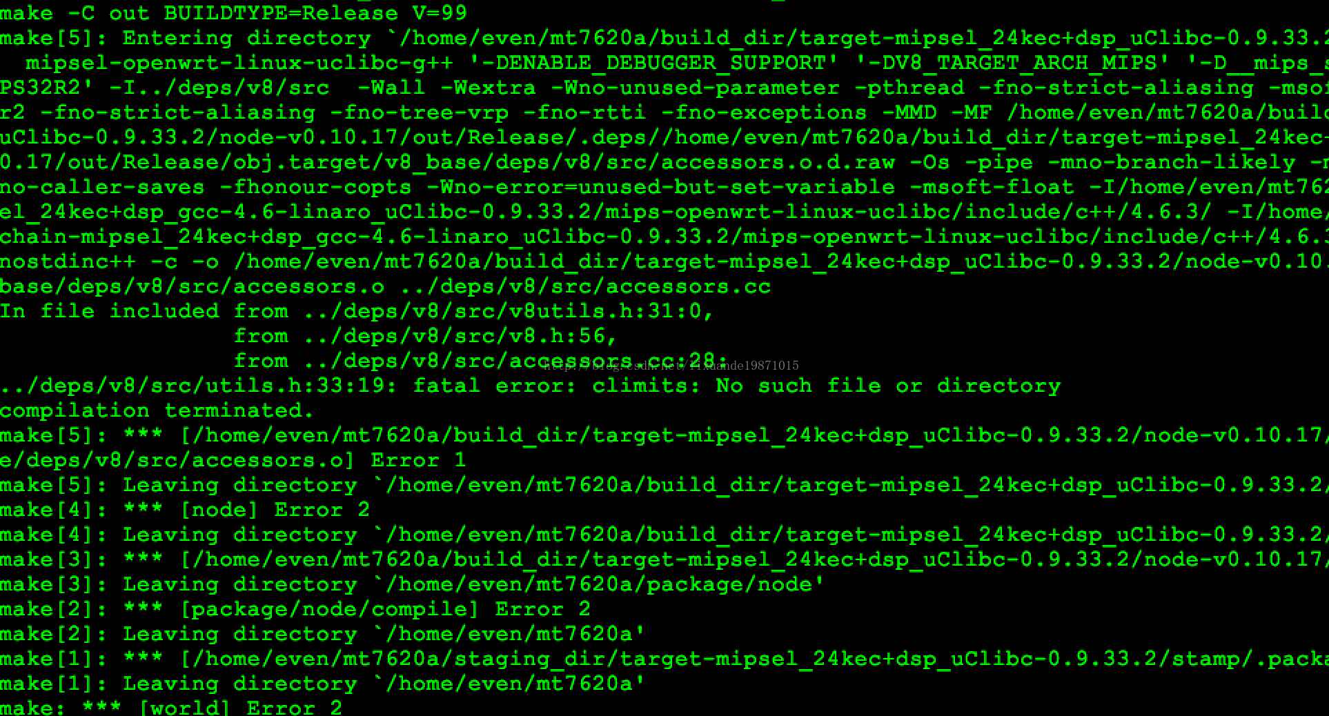 发现是climits找不到,这个是系统级的头文件,找不到的话,应该是编译的工具链的问题,仔细看来一下makefile,发现有一个宏定义的指向是mipsel,因为我的板子是7620a的,但是下级路径却指向了mips