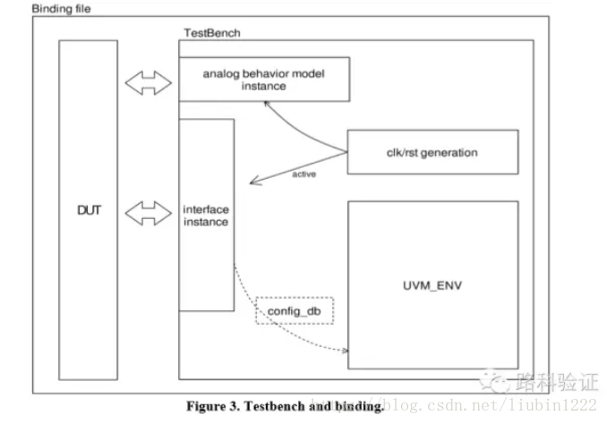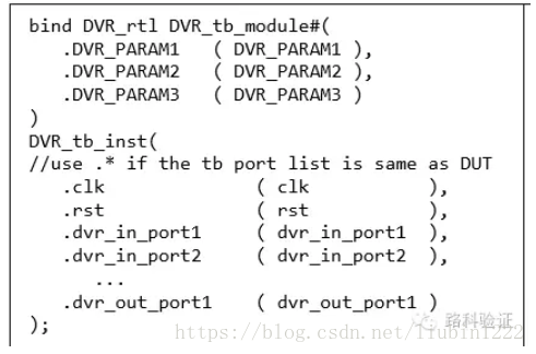 为了能够更简单的复用验证环境,我们把整个IP的TB用SV的bind方法链接到DUT下面,这样,无论DUT在哪里例化,那TB的环境也会被一起带进去,我们要做的改变是通过配置模块关掉TB中的agent,sequence等等,只留下monitor和scoreboard,并把接口中的信号连向上一层的RTL输出,这样顶层的验证人员不需要对被bind上去的TB环境做任何改动,就可以实现对IP DUT的验证,下面是bind的代码