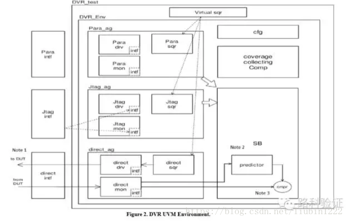 逻辑上看,DVR模块有三组接口,我们将会设计三个代理(agent)来分别与它们交互,每一个代理都分别有一个sequencer,driver,monitor,每个driver和monitor都会拿到虚拟接口的句柄进行驱动和采数,每个sequence(数据和控制信息)会通过代理中的sequencer被发送到driver中去,driver负责把接收到的sequence顺序驱动到接口上去,下图展示了我们针对DVR的整个验证框架