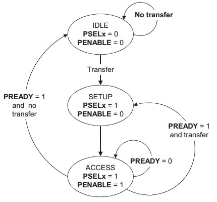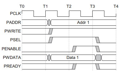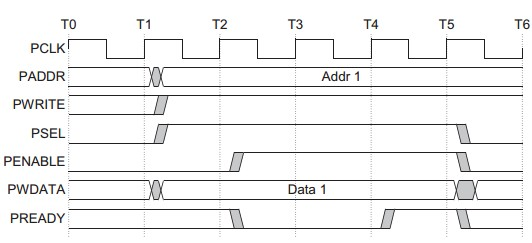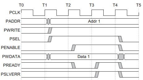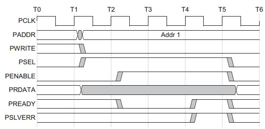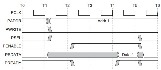 无等待状态从器件必须在读传输结束前提供数据。有等待状态在Access phase期间PREADY信号拉低,则传输被扩展。