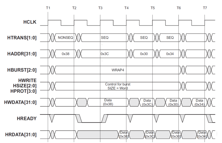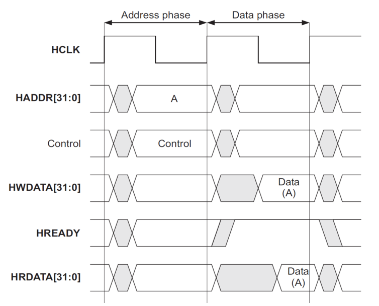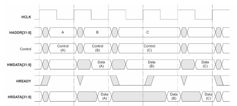 - 等待状态时写操作已经将数据B写在数据总线上,读操作却不需要提前读取数据B,等检测到HREADY信号为高时,读取数据B到读数据总线上。