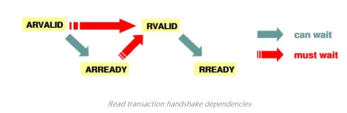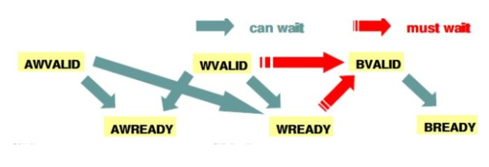 VALID与READY信号作为一对握手信号,为防止死锁,进行读操作时,必须等读地址通道握手完成,读数据通道才可进行下一步操作。进行写操作时,写地址通道与写数据通道互相独立,但同样必须等最后一组数据写完成写响应通道握手完成。