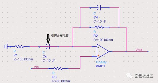 当某些频率点上的环路增益Aβ等于1,而相位为-180°的时候,这时,Vout/Vin会变成无穷大,电路就不稳定了。因此,当外部增加一个零点时,运放就会在某些频率点进入震荡,比如引脚上的分布电容,如下图: