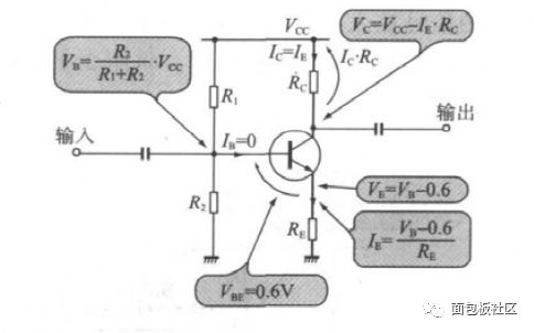 当输入的Vb发生变化时,Ie就会随着Vb发生相应的变化,从而引起Vc的变化,这就是跟随。若Vb继续增大到,使得Vc=Vcc-Ie x Rc计算值为负数的时候,而实际上Ie x Rc并不能超过Vcc,这时放大电路达到饱和甚至电流反相,导致输出电压固定或削峰或反向等。