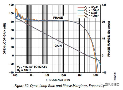 这时,我们并上一个电容,相当于人为引入一个零点,把拉下去的相位,拉上来,但是,这个分布电容一般很小,使得它环路增益Aβ等于1的位置非常远,在这么远的频点上,运放早就不能正常工作了。而看手册这个运放自身在100k的时候,相位余量相当的高,超过了90°,完全不需要增加额外的补偿电容。