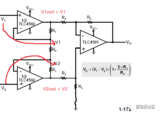 正相输入电压和反相输入电压体现在仪放内部的R2处,而真正进行输出的电压,是由V1out和V2out体现的,换一句话说,最终增加的电压值平分为两份,一份由V1out提供,它会比V1高,另外一份由V2out提供,它会比V2低。